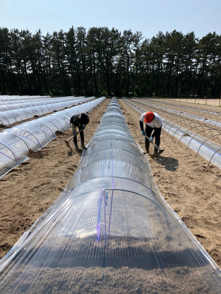 めろん日記(2024年度) ~ある日のめろん畑~ めろん日記(2024年度) X Facebook コピー 2024.06.20 ※pcでの閲覧を推奨いたします。 今日は、今シーズン最後のメロン植えでした。最近の強風でなかなか作業できず、トンネルビニールをかけながらの定植です(^^;) 元気に育ってね! トカゲ発見!